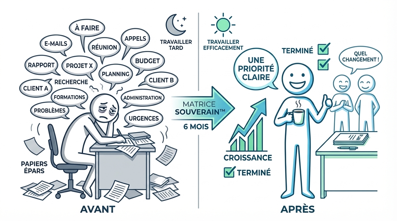 D'autres entrepreneurs utilisent la Matrice SOUVERAIN™, identifient leur verrou en 7 jours, reçoivent leur plan de déblocage personnalisé, et commencent enfin à avancer.